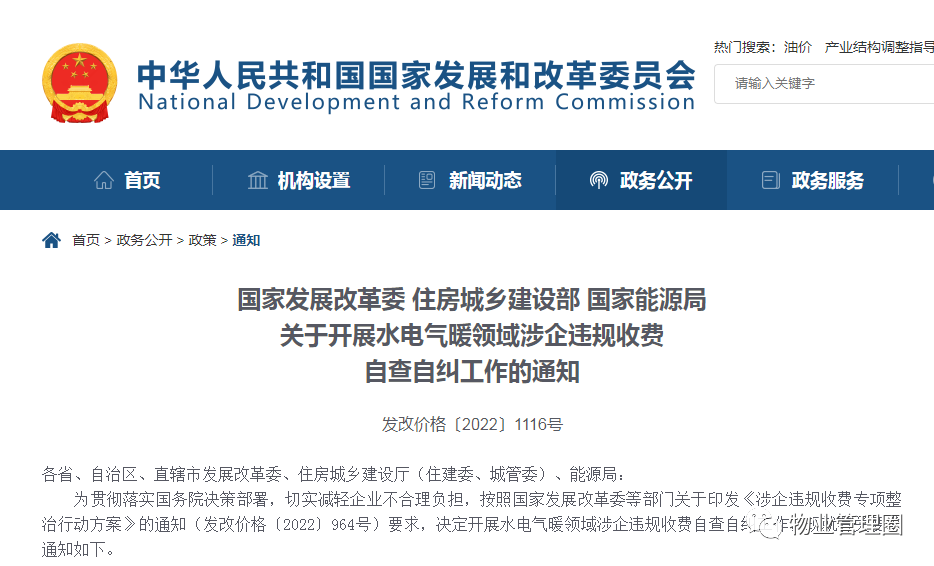 近日,国家发展改革委网站发布《关于开展水电气暖领域涉企违规收费自查自纠工作的通知》通知如下: